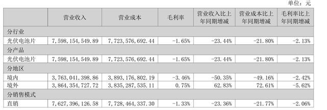 而代表其核心盈利能力的毛利率也一降再降,光伏电池片总体毛利率-1.65%,同期下降2.13个百分点,正式步入越卖越亏行列,其中海外市场毛利率更是大幅下降5.62个百分点,降至0.75%,最寄予厚望的海外市场并未成为业绩的增长点。