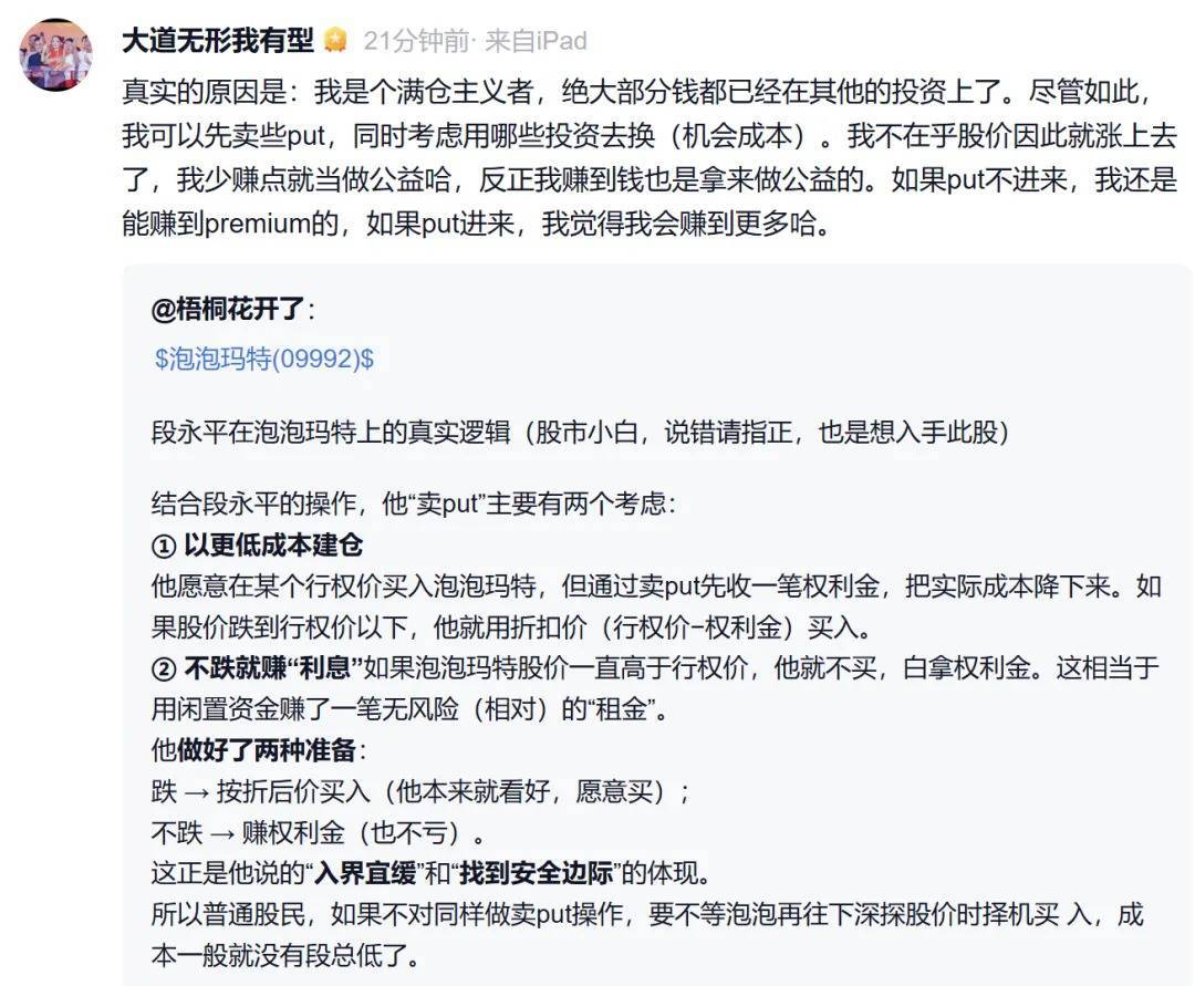 14日上午,段永平再次确认通过卖put的方式买入泡泡玛特。对于通过以卖出看跌期权方式介入,段永平给出的解释是目前资金不充裕。