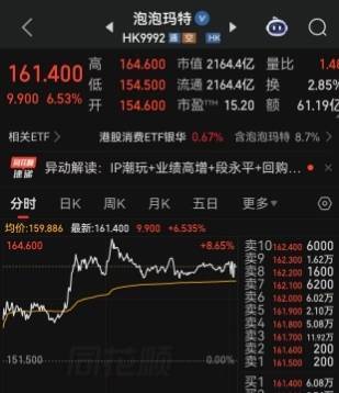 截至收盘,泡泡玛特上涨6.53%,报161.4港元/股。