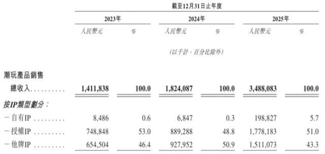 但真正撑起TOP TOY业绩大盘的,实际是授权IP与他牌IP这对“外部双引擎”,两者分别在2025年贡献了51.0%和43.3%的收入,合计占比超过94%,在很大程度上影响着TOP TOY的收入走向。