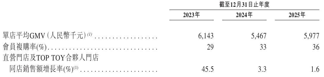 然而,TOP TOY的单店平均GMV却由2023年的614.3万元降至2025年的597.7万元,直营门店及合伙人门店同店销售额增长率也由45.5%骤降至1.6%。换句话说,在门店数量快速扩张的同时,其单店产出效率正悄然承压。